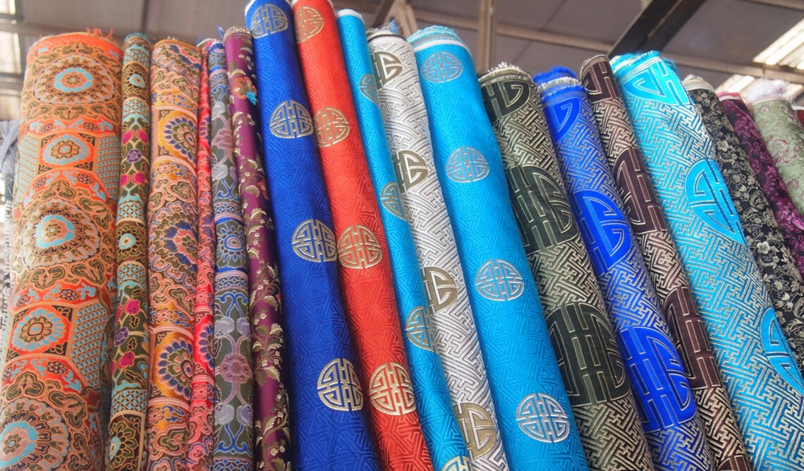 One of the Ankhai's silk-makers, Kydaana, offers bolts of silk made by herself to varying colours, patterns and styles.