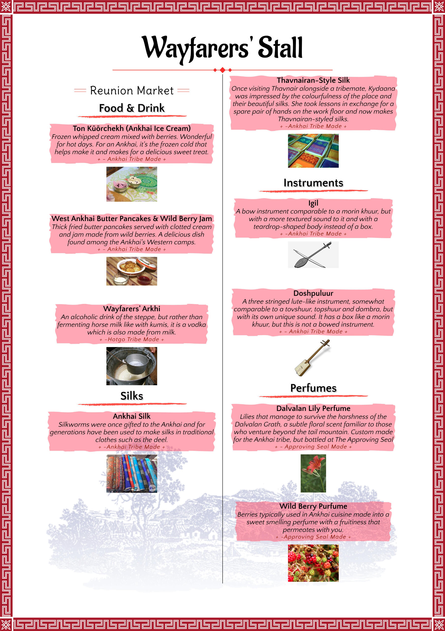 The Ankhai Tribe were once an isolated tribe who live in the Northern parts of the Tail Mountains and in Dalvalan Grath. Aspects of the Ankhai (and ergo, their goods) are inspired by Sakhalar/Yakuts and Tuvans.