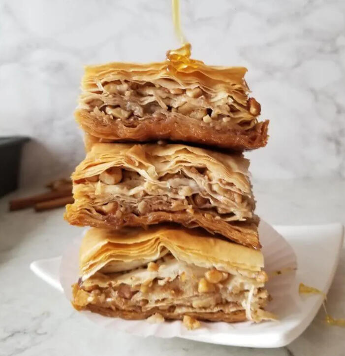 A dessert made with layers of pastry, walnuts, cloves, cinnamon and butter. It is deliciously flakey, syrupy and nutty.